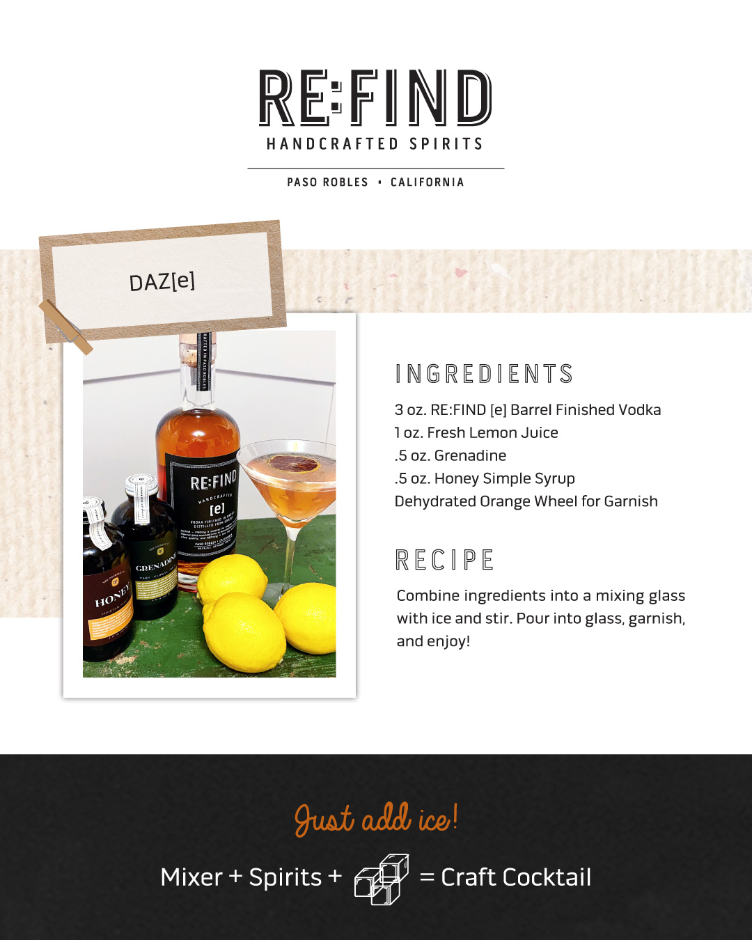 Includes: 1 - Re:Find [e] Vodka Finished in Barrel (750ml | 46.5% Alc 93 Proof) 1 - YES Grenadine (8 oz) 1 - YES Wildflower Honey Syrup (8 oz)