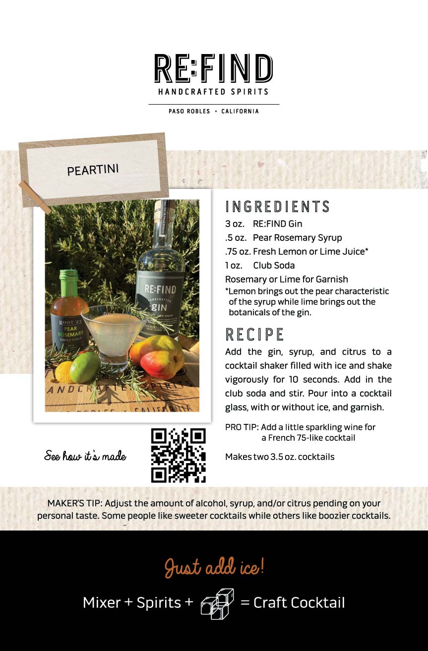 Includes: 1 - Re:Find Gin (750ml | 46% Alc 92 Proof)1 - Pear Rosemary Syrup (200ml)1 - Fever Tree Club Soda (200ml)1 - Dried Lemon Garnish1 - Recipe Card